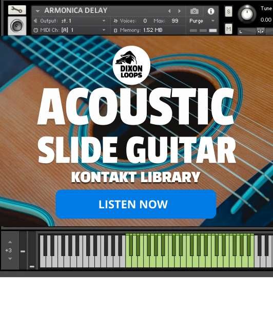 Acoustic Slide Guitar is a Kontakt library that captures the warm, expressive sound of slide guitar played on a steel-string acoustic. Ideal for blues, folk, and cinematic scoring, it offers realistic slides, harmonics, and rich articulations for authentic performance.
